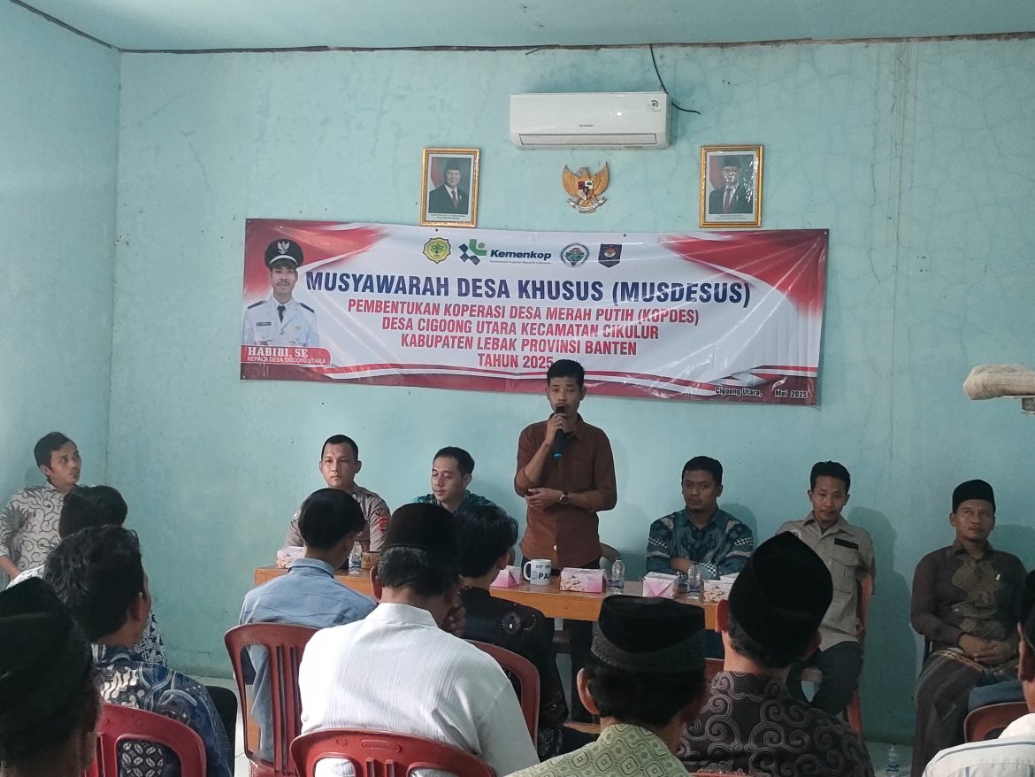 Lebak – Cigoong Utara, 22 Mei 2025 – Pemerintah Desa Cigoong Utara, Kecamatan Cikulur, Kabupaten Lebak, Provinsi Banten, menyelenggarakan Musyawarah Desa Khusus (Musdesus) dalam rangka pembentukan Koperasi Desa Merah Putih (Kopdeskel MP), bertempat di Balai Desa Cigoong Utara.