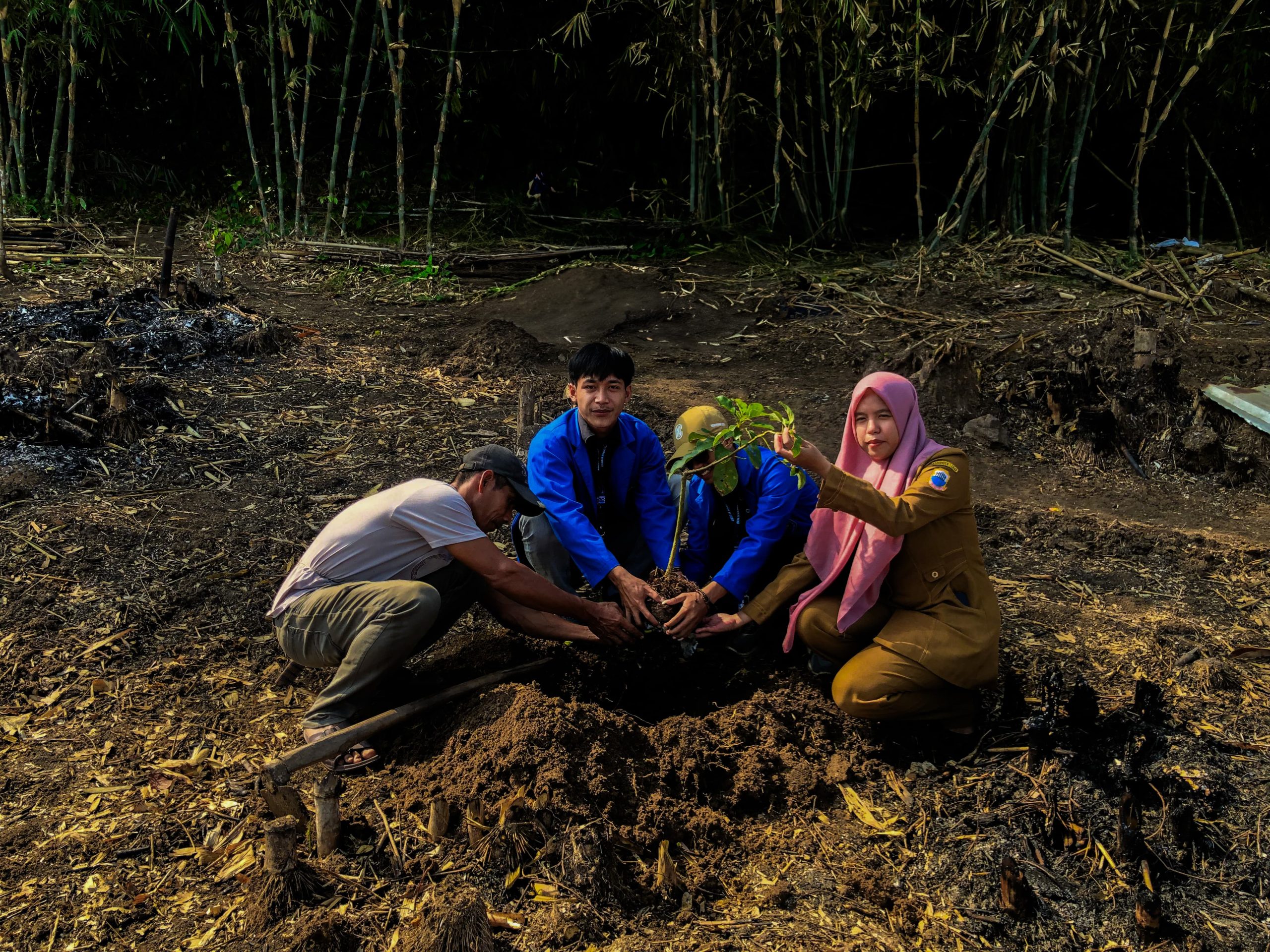 Para mahasiswa BKM dan perangkat desa bahu-membahu menanam bibit-bibit alpukat yang diharapkan dapat menjadi sumber pangan berkelanjutan bagi warga.