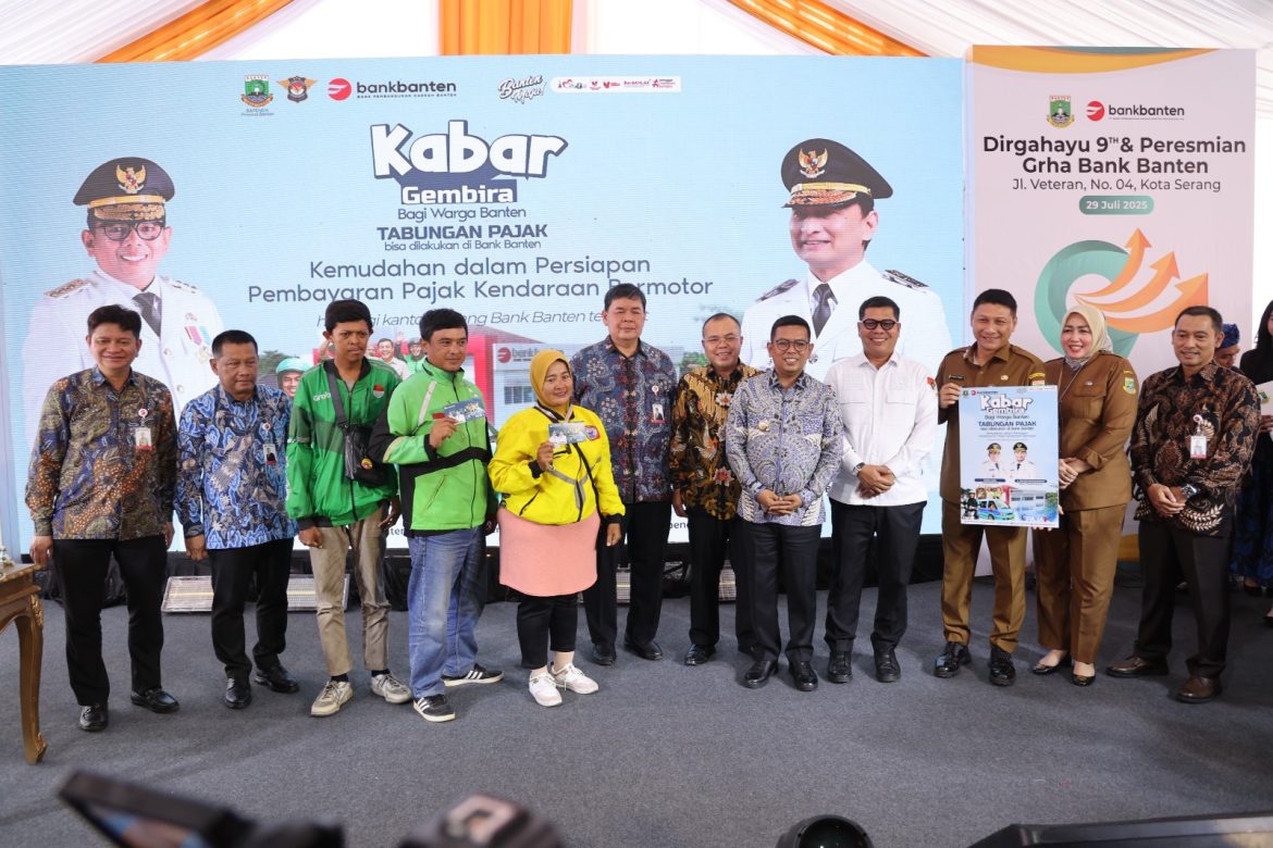 Banten – Gubernur Banten Andra Soni meresmikan program Tabungan Pajak Kendaraan Bermotor (TPKB) bersamaan dengan peresmian Gedung Grha Bank Banten sebagai Kantor Pusat PT Bank Pembangunan Daerah Banten Tbk (Bank Banten), di Jalan Veteran No. 4, Kota Serang, Selasa (29/7/2025). Melalui TPKB, masyarakat bisa menabung atau mencicil pajak kendaraan bermotornya sebelum jatuh tempo.